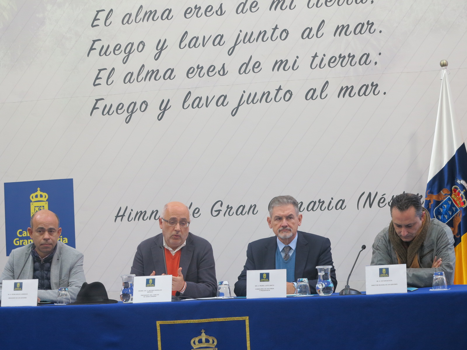 El presidente del Cabildo de Gran Canaria, Antonio Morales, y el grupo Los Gofiones, presentaron el amplio programa de actos conmemorativos con los que a lo largo de este 2018 se celebrará la efeméride del 50 Aniversario de la fundación del citado grupo de música popular, y que arranca el próximo mes de marzo con el estreno del espectáculo que rememora estos 50 años de trabajo. Tres conciertos que Los Gofiones ofrecerá en el Teatro Pérez Galdós, el coliseo que acogió precisamente su presentación pública en 1969.